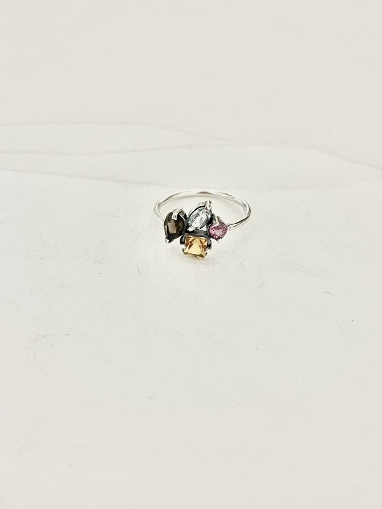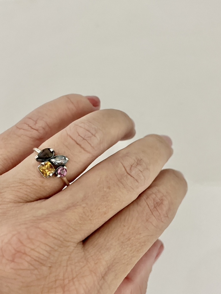 • Dimensões:  Largura central: 2,3 cm. / Pedras: Ametista 5 x 2.5 mm, Citrino 4 mm, Topázio Incolor 4 mm, Topázio Azul 5 x 3 mm, Rodolita 3 mm e Granada 6 x 4 mm. / Aro em fio redondo 1.5 mm.