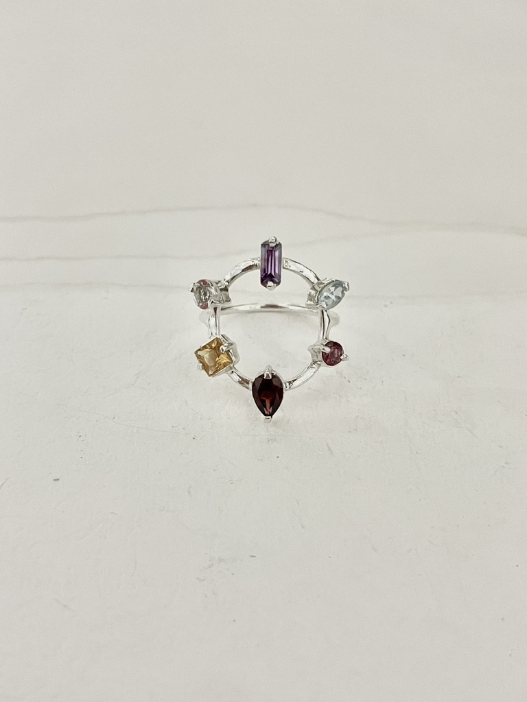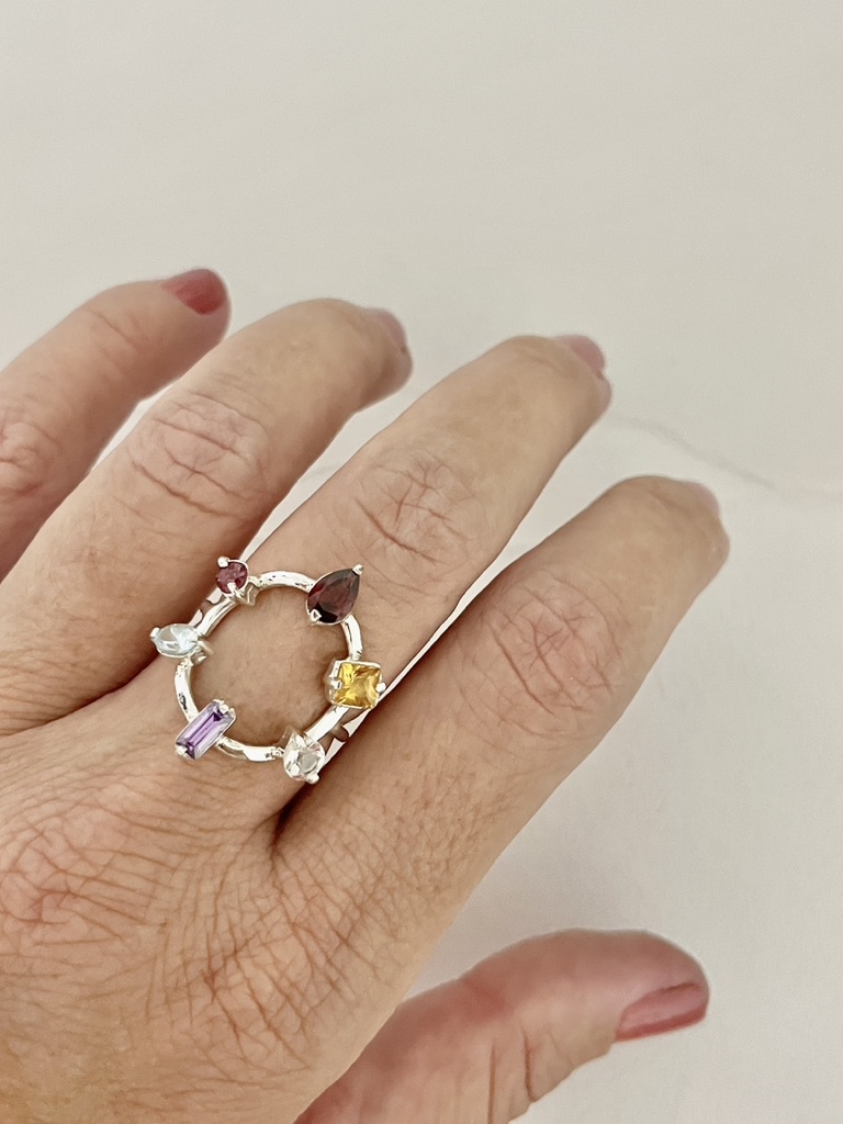 • Dimensões:  Largura central: 2,3 cm. / Pedras: Ametista 5 x 2.5 mm, Citrino 4 mm, Topázio Incolor 4 mm, Topázio Azul 5 x 3 mm, Rodolita 3 mm e Granada 6 x 4 mm. / Aro em fio redondo 1.5 mm.