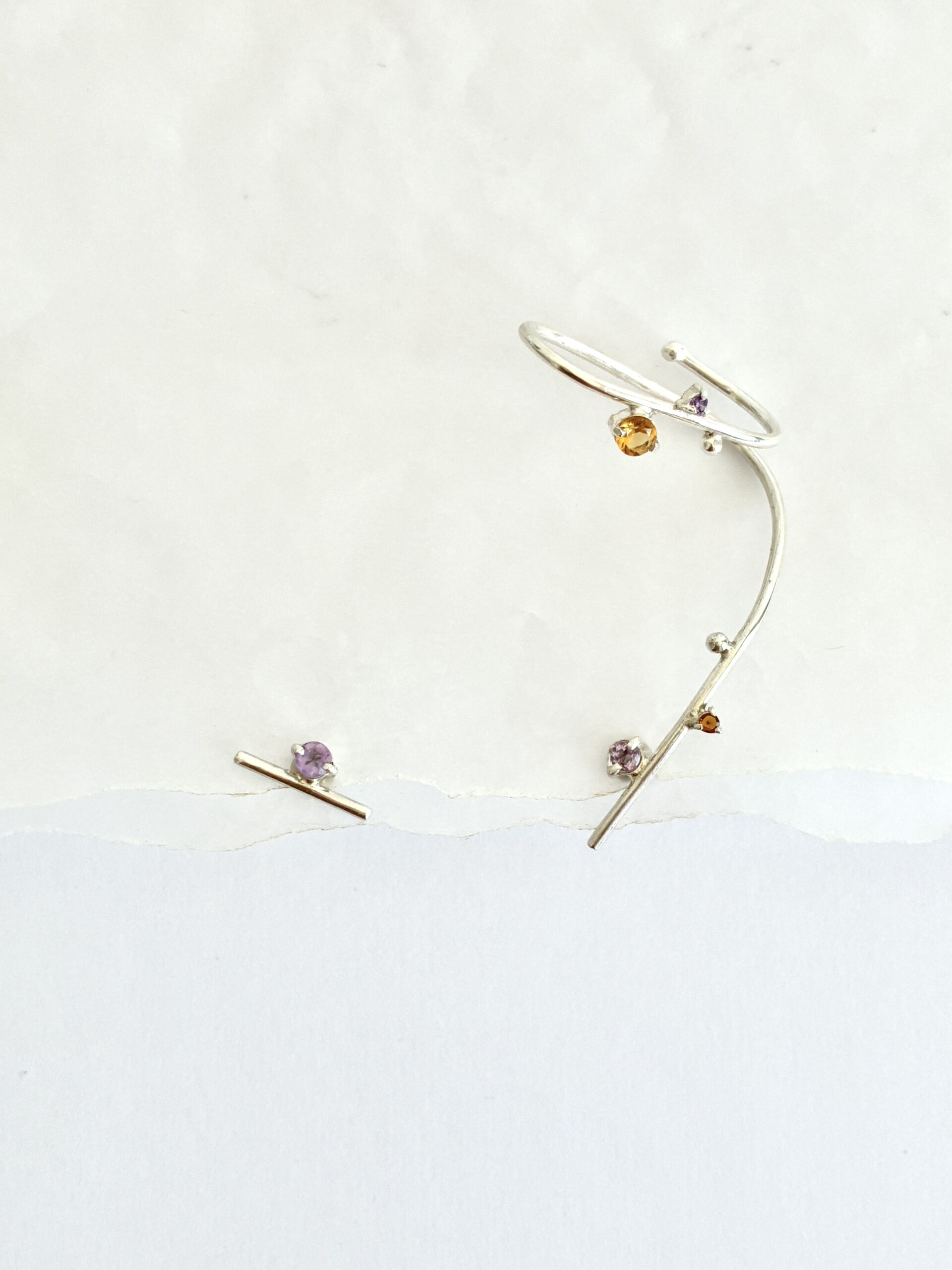 • Dimensões: Comprimento sob medida no cuff e parte menor da outra orelha possui 1,5 cm de comprimento. / Pedras: Ametistas de 2 e 3 mm, Citrinos de 2 e 4 mm./ Modelado em fio redondo 1.4 mm.