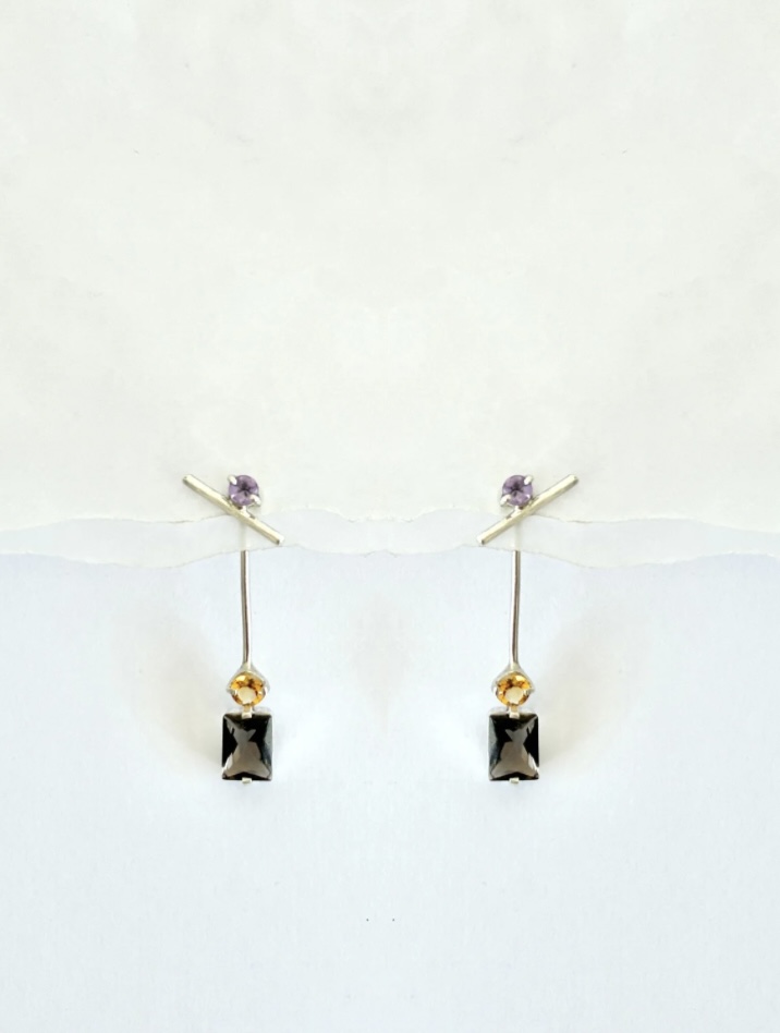• Dimensões: Parte menor possui 1,5 cm de comprimento e parte removível mede 3,5 cm de comprimento./ Pedras: Ametista de 3 mm, Citrino de 4 mm e Quartzo fumê 8×6 mm. / Modelado em fio redondo 1.3 mm.