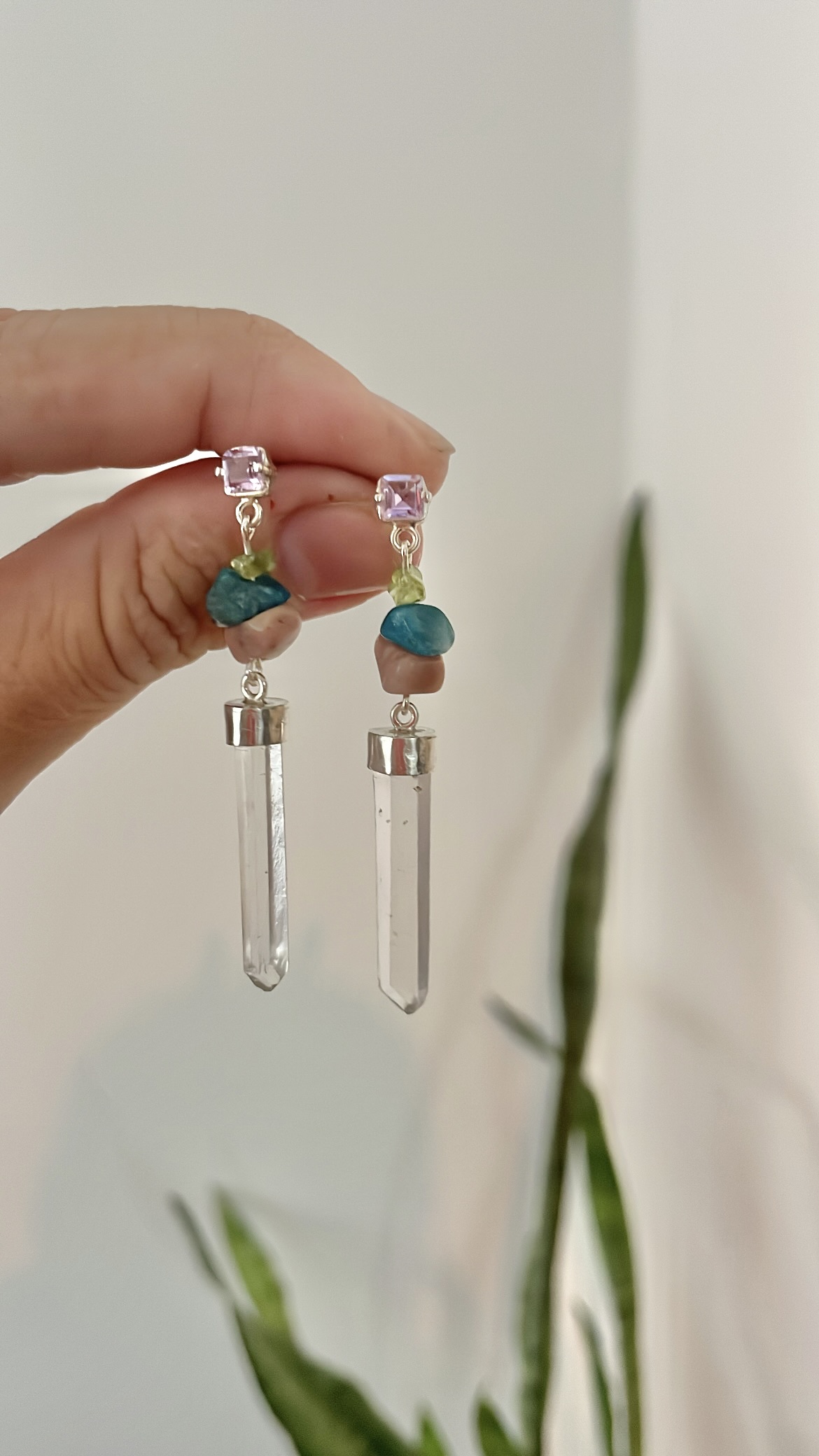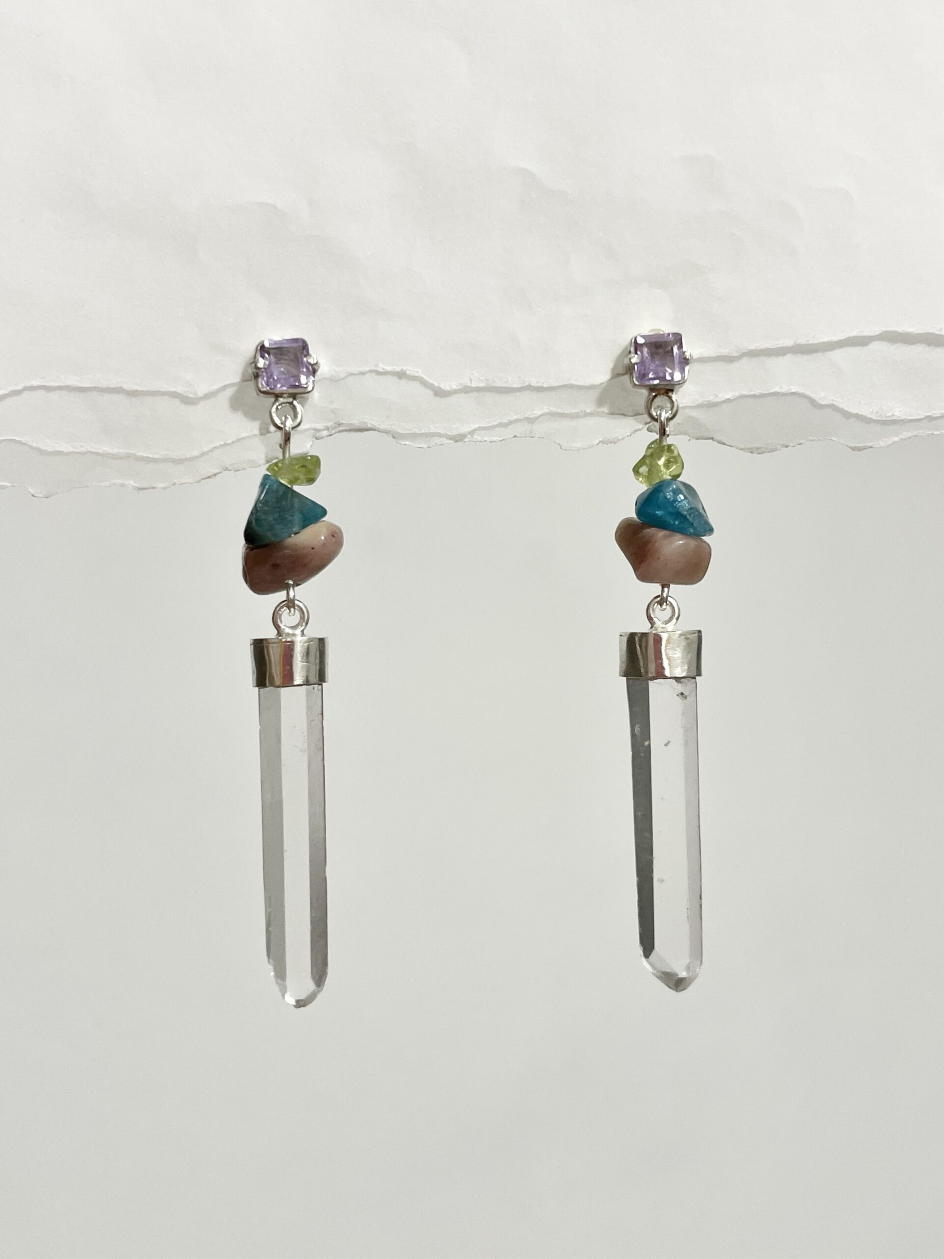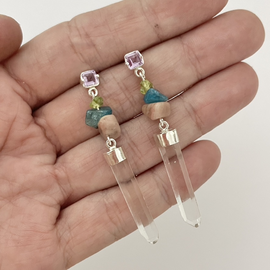 • Dimensões: 5,5 cm de comprimento. / Pedras: Apatita, Peridoto e Rodonita irregulares, Ametista 4 mm e Quartzo Cristal de 2,5 à 3 cm de comprimento.