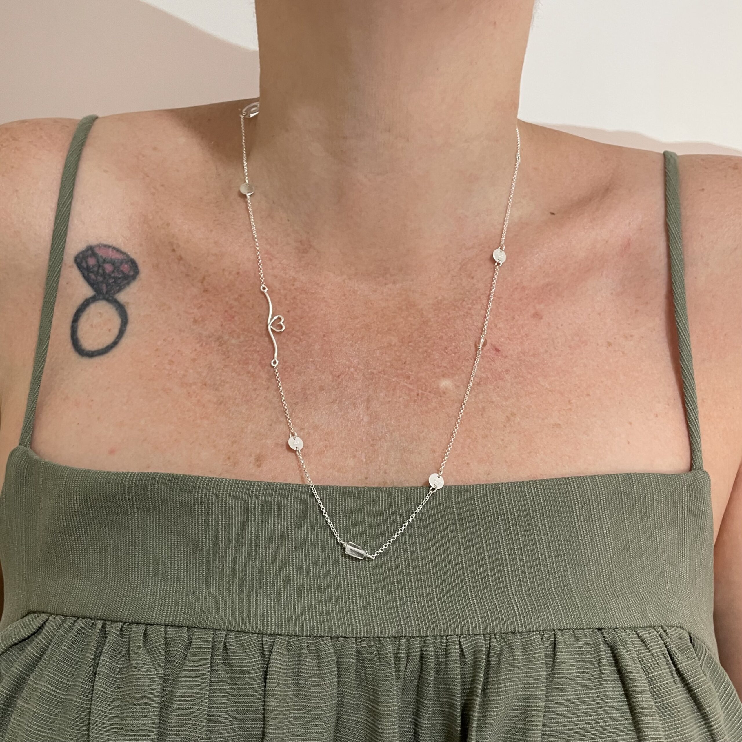 • Dimensões: 60 cm total, mas com 2 reduções (em 55 e 50 cm). / Corrente com 1.3 mm de espessura aproximadamente (pode variar). / Chapinhas: 6 mm. / Fio com desenho de coração: 3 cm de comprimento. / Pedras: Redonda 4 mm, Retangular 8 mm x 4 mm (irregular e podendo variar) e Oval 1 cm x 8 mm. *Pedras podem possuir ou não, inclusões aparentes.